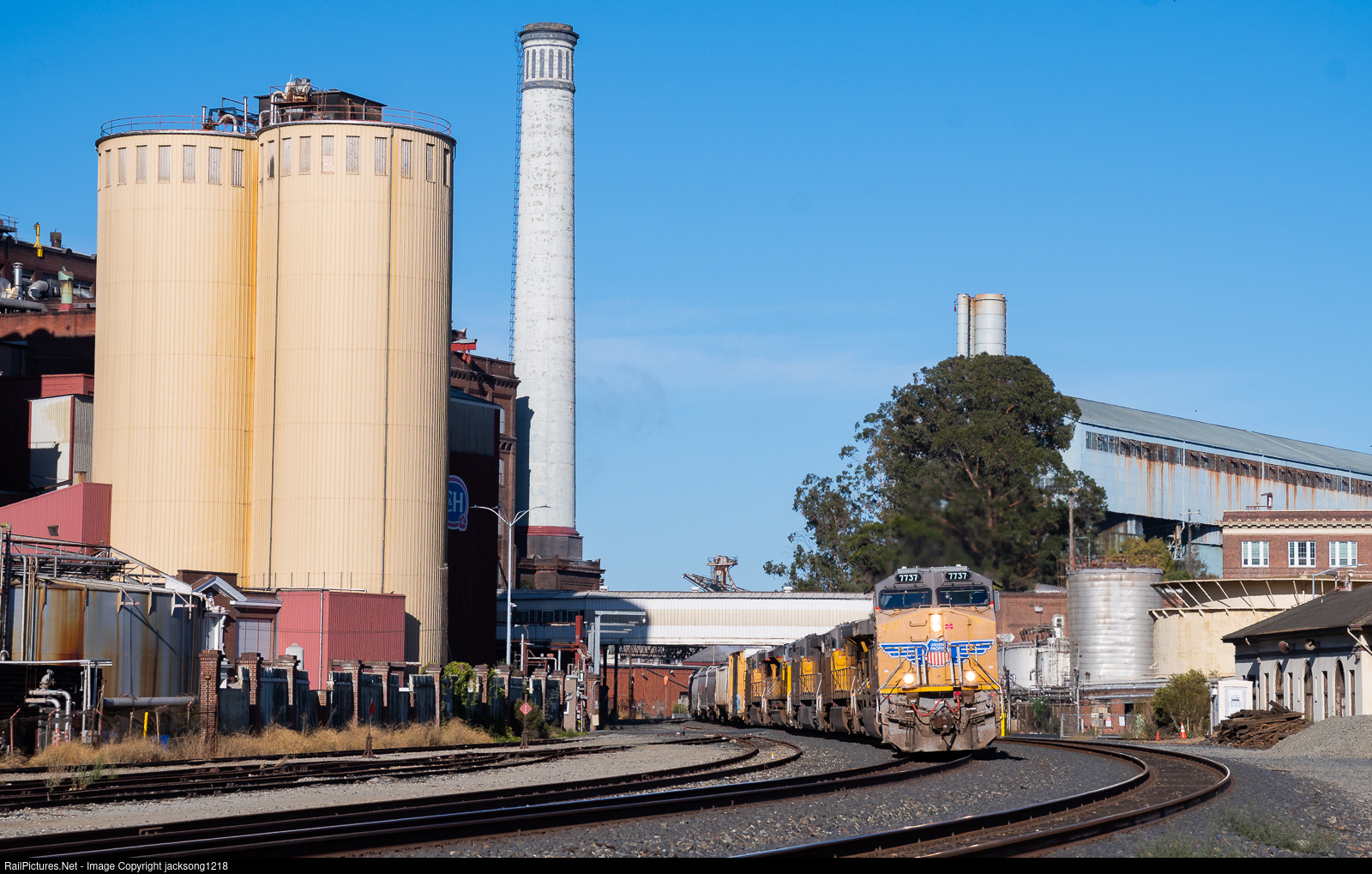 | Union Pacific train MRVOA (Roseville, CA - Oakland, CA) passes through the C&H cane sugar factory in Crockett, CA |