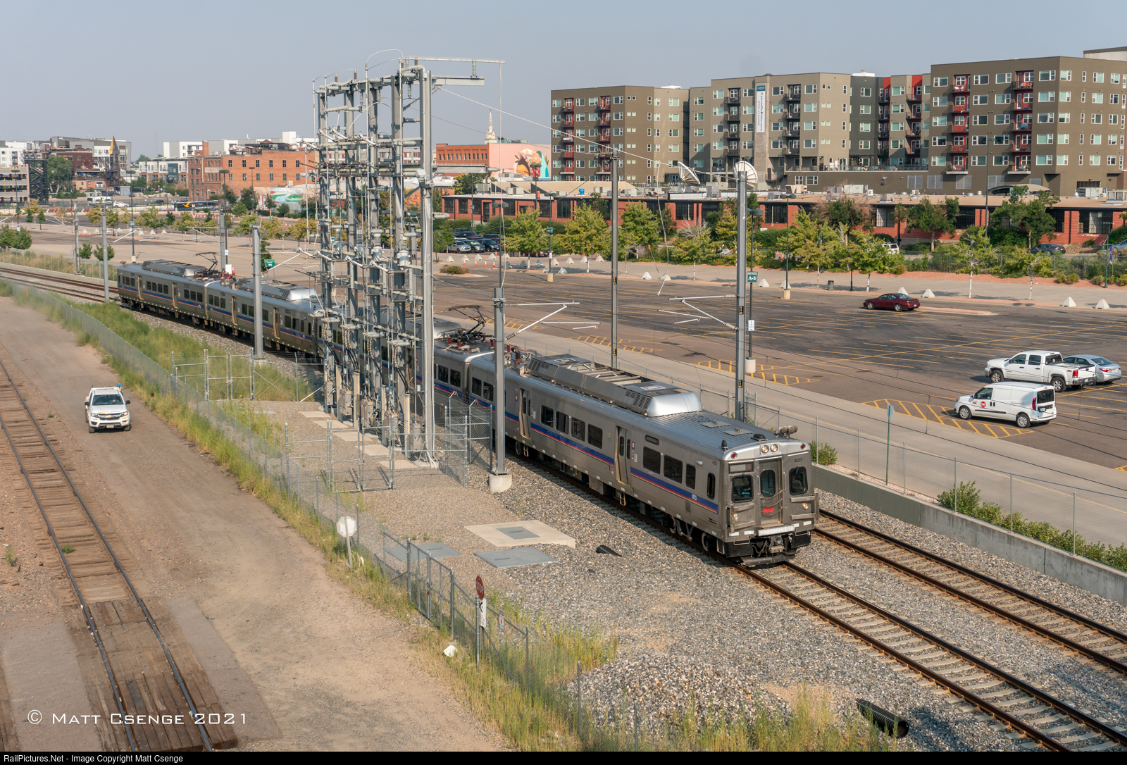 An inbound RTD A Line train is seen from the Park Ave W overpass as it nears its final station: Union Station. The train is passing what appears to be a substation, converting electricity from the City's grid to traction power for the line. |