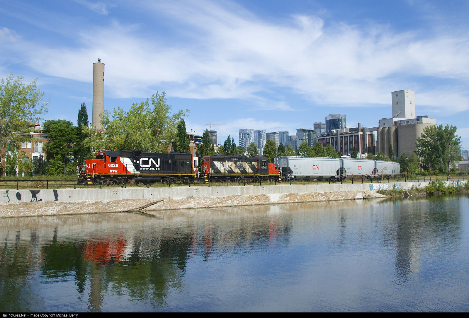 | GTW 6226 & CN 4141 are shoving six grain loads to Ardent Mills, seen at right. The train is on the East Side Canal Bank Spur, which parallels the Lachine Canal on its north bank and only serves this one client. |
