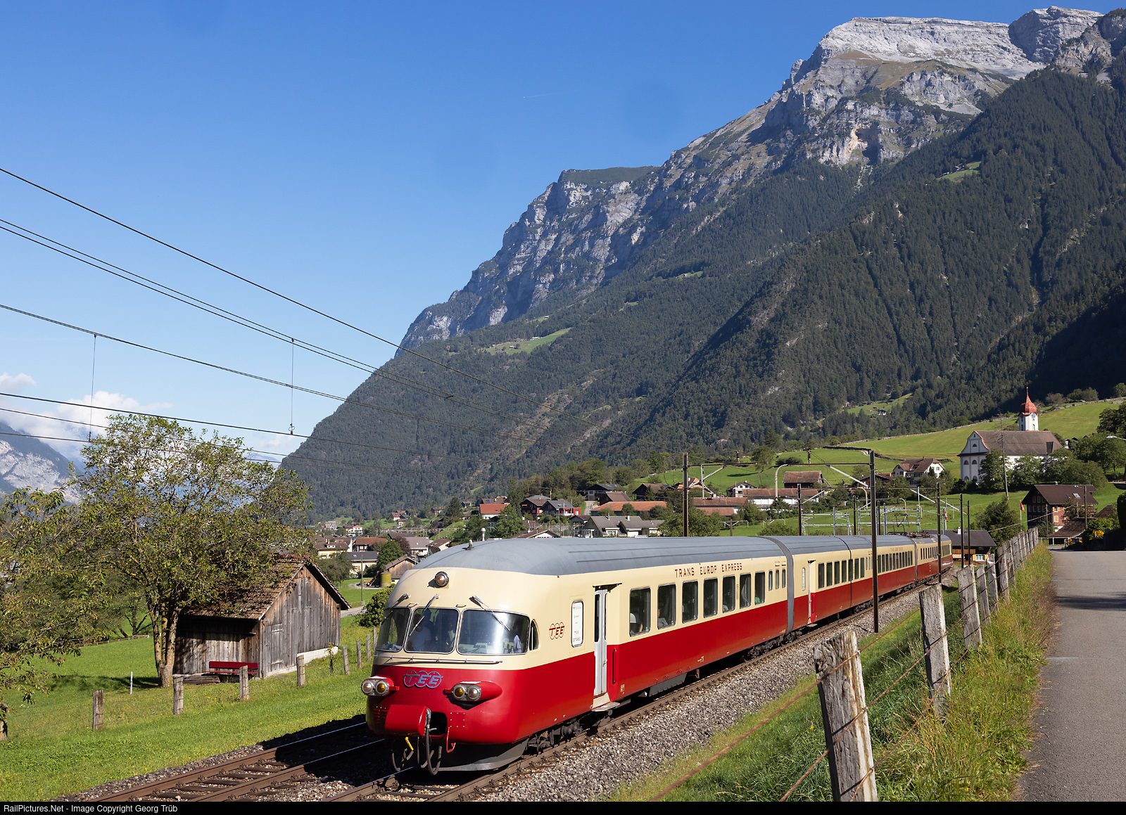 | On the occasion of the "Gotthard-Bahntage" the timeless elegant TRANS EUROP EXPRESS RAe TEE II # 1053 (built in 1961) of SBB Historic is running train 31149 from Erstfeld to Göschenen, passing the church of Silenen between Erstfeld and Amsteg-Silenen. The train came from Olten in the morning. |