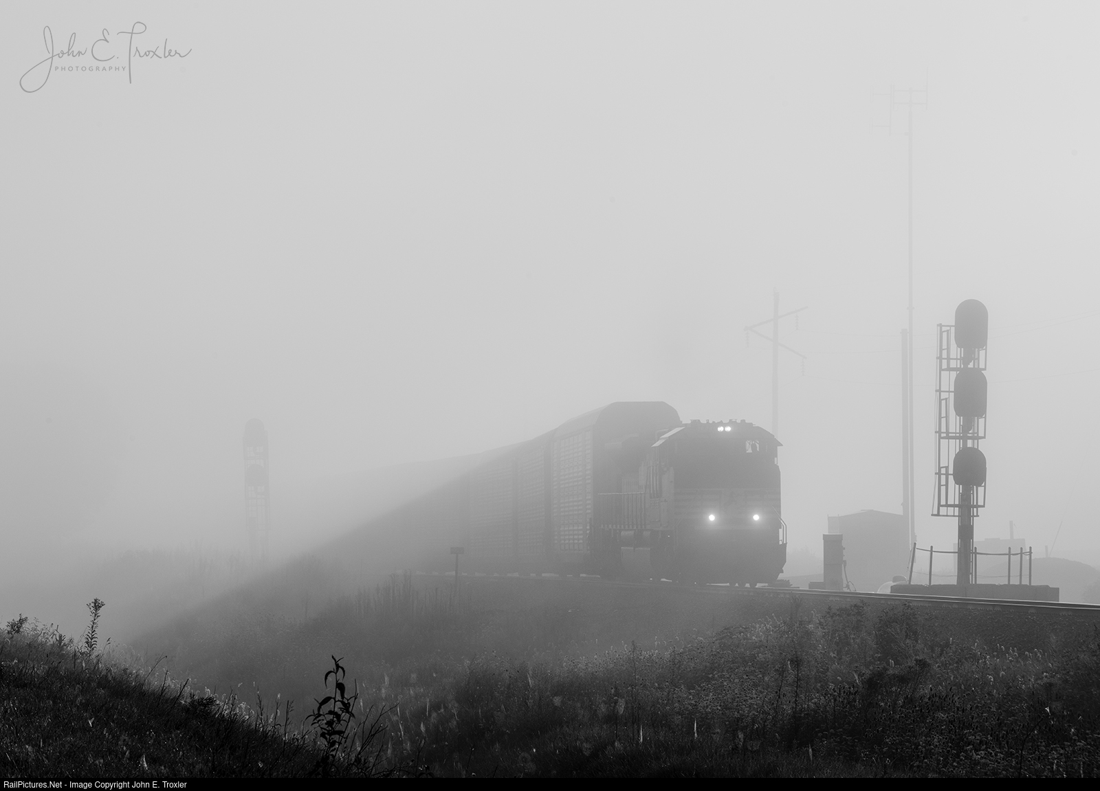 | Westbound Norfolk Southern train #121 pierces the morning fog at CP Yuill west of Rockfield, IN on Norfolk Southern's former Wabash line during the morning of 08/13/17. |
