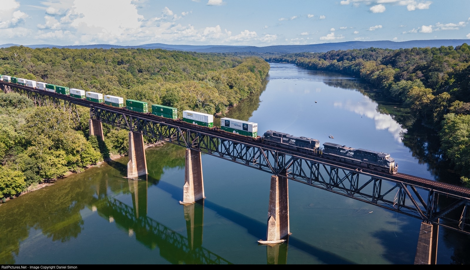 | Norfolk Southern train 203 (Rutherford, PA-Atlanta, GA intermodal) makes its trek across the Potomac River. |
