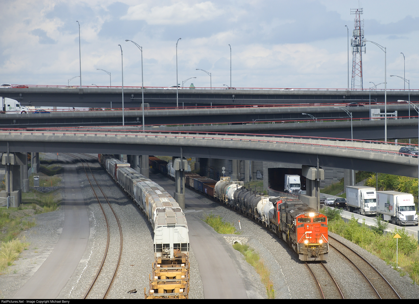 The head end of CN 527 dodges clouds as it emerges from the Turcot Interchange with CN 8017, NS 9798 & CN 2570 for power.