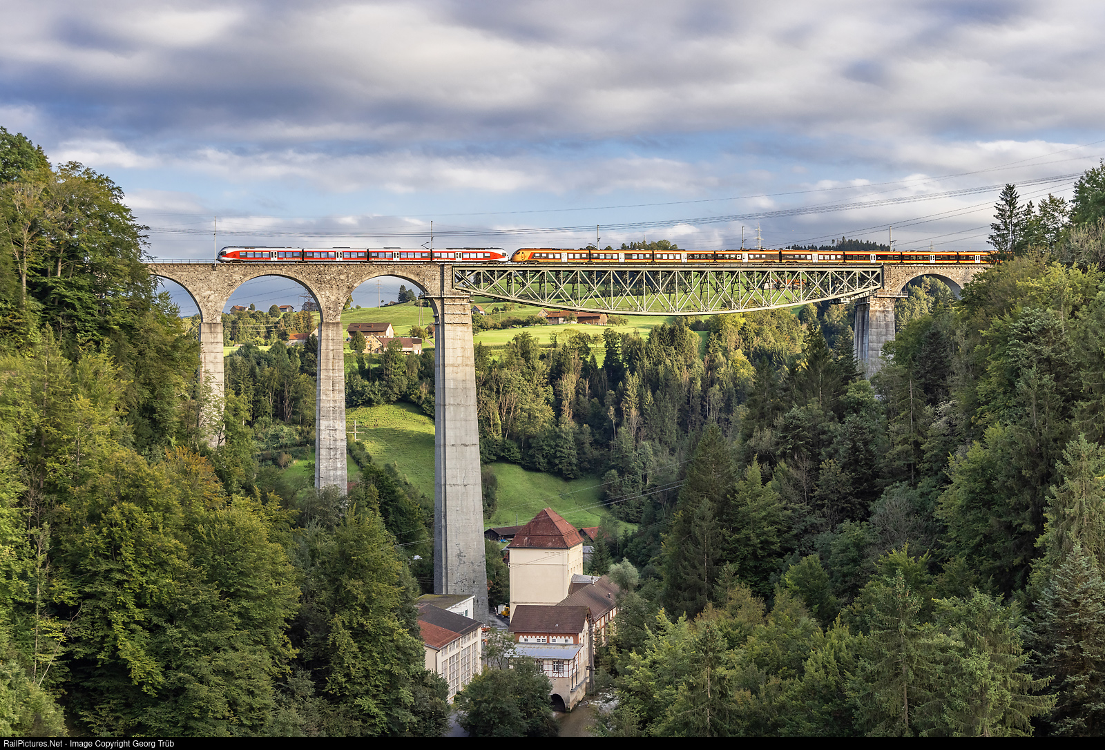 The Interregio 2032 VORALPEN EXPRESS of the Südostbahn, with a "Traverso" RABe 526 and a "Flirt" RABe 526.0, is crossing the 99 meter high Sitter viaduct between St.Gallen Haggen and Herisau (Gübsensee crossing station), highest railway bridge of Switzerland. The Sitter viaduct has a main span of 120 meter, a length of 365 meter and was built between 1908 and 1910 for the Bodensee-Toggenburg-Bahn (BT) from Romanshorn via St.Gallen-Herisau-Wattwil to Nesslau. The trussed girder has a weight of 920 metric ton. Down in the gorge the Kubel hydro power station of 1900, very first storage power plant of Switzerland, using the nearby Gübsensee for water storage.