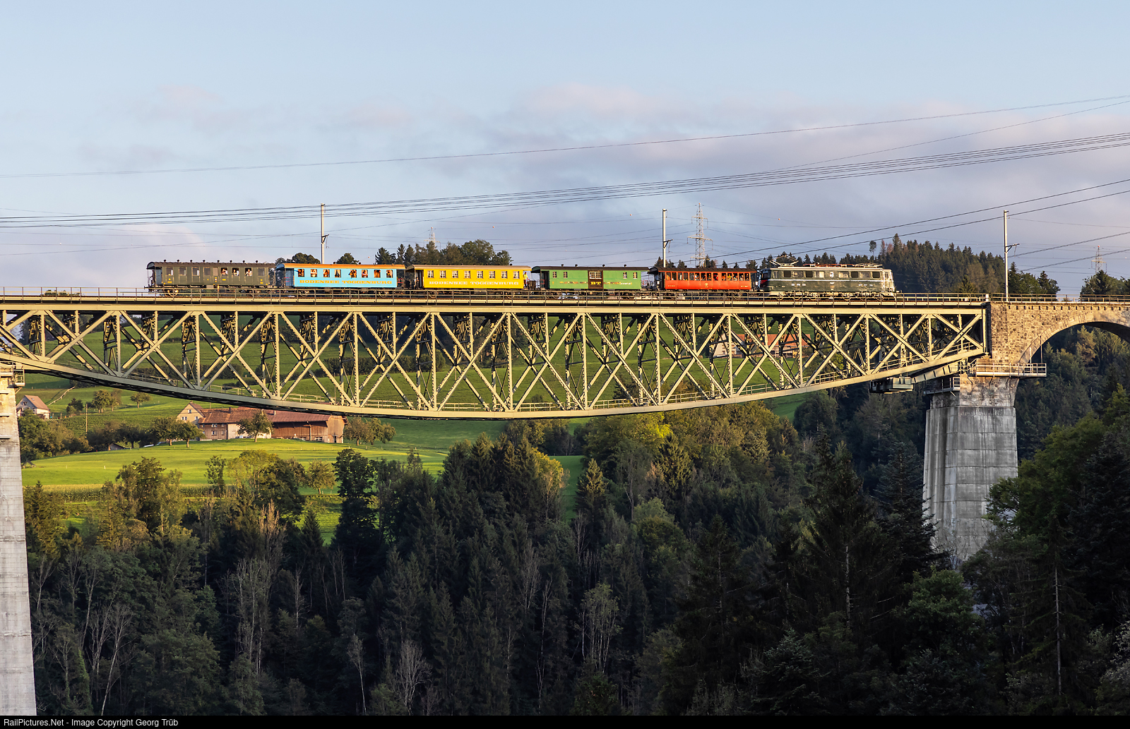 Ae 6/6 # 11407 "Aargau" of SBB Historic, on long term loan to asociation "Mikado 1244" in Brugg AG, is crossing the highest railway bridge in Switzerland, the 99 meter high Sitter viaduct between St.Gallen Haggen and Herisau, with cars of the AMOR Express (former Bodensee-Toggenburg-Bahn) and a red buffet car of the DVZO. The train circulated to celebrate the renovated viaduct for the workers involved in the construction work. The trussed girder of this bridge, built from 1908 to 1910 for the Bodensee-Toggenburg-Bahn, has a main span of 120 meter.