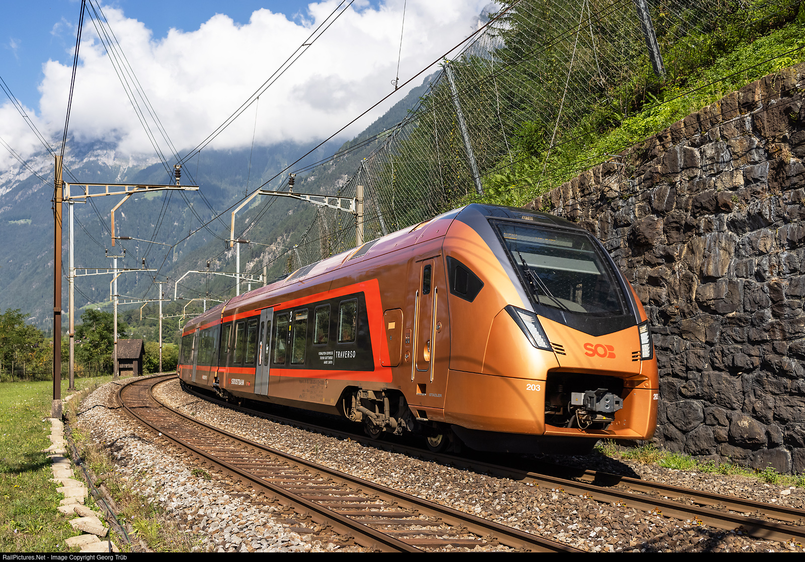| "Traverso" train RABe 526 # 203/103 of the Südostbahn (SOB) is running the "Treno Gottardo" IR 2323 of the line IR 26 from Basel via Olten-Lucerne-Arth Goldau-Gotthard mountain line-Bellinzona to Locarno, passing a typical Gotthard railway cable hut between Amsteg-Silenen and Gurtnellen. |