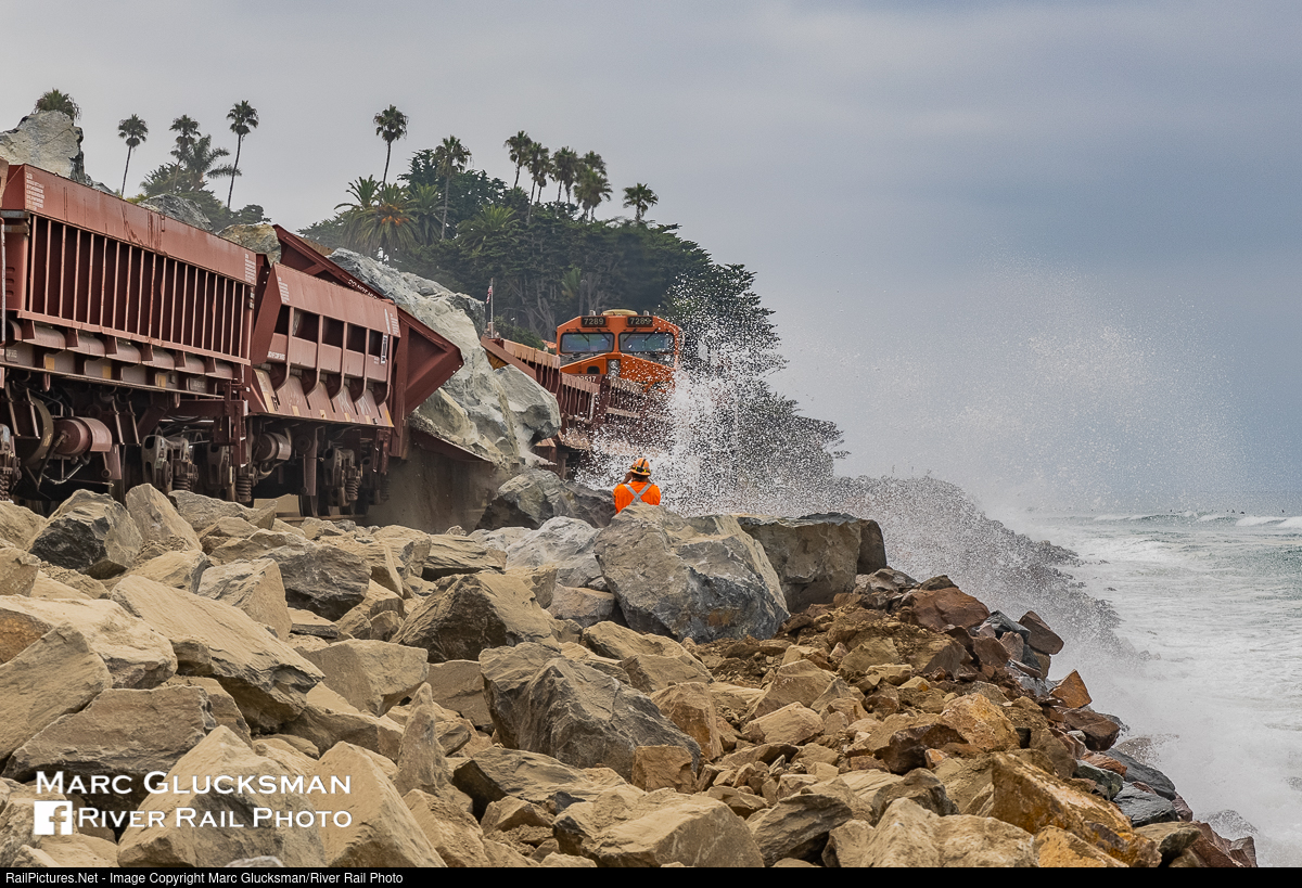 Train On The Rocks. BNSF Railway 7289(ES44DC) was trailing on the lead of the second W-SBDSBD that arrived in San Clemente, California trains loaded with rip rock and ballast. Due to "earth movement", Amtrak and Metrolink service through the area has been suspended since the morning of Thursday, September 16, 2021 as BNSF works with other area railroads to stabilize the track so that passenger trains can return. On the morning of Sunday, September 19, 2021, the train was unloading on the shores of the Pacific Ocean as the water was making is presence known to the work crew.