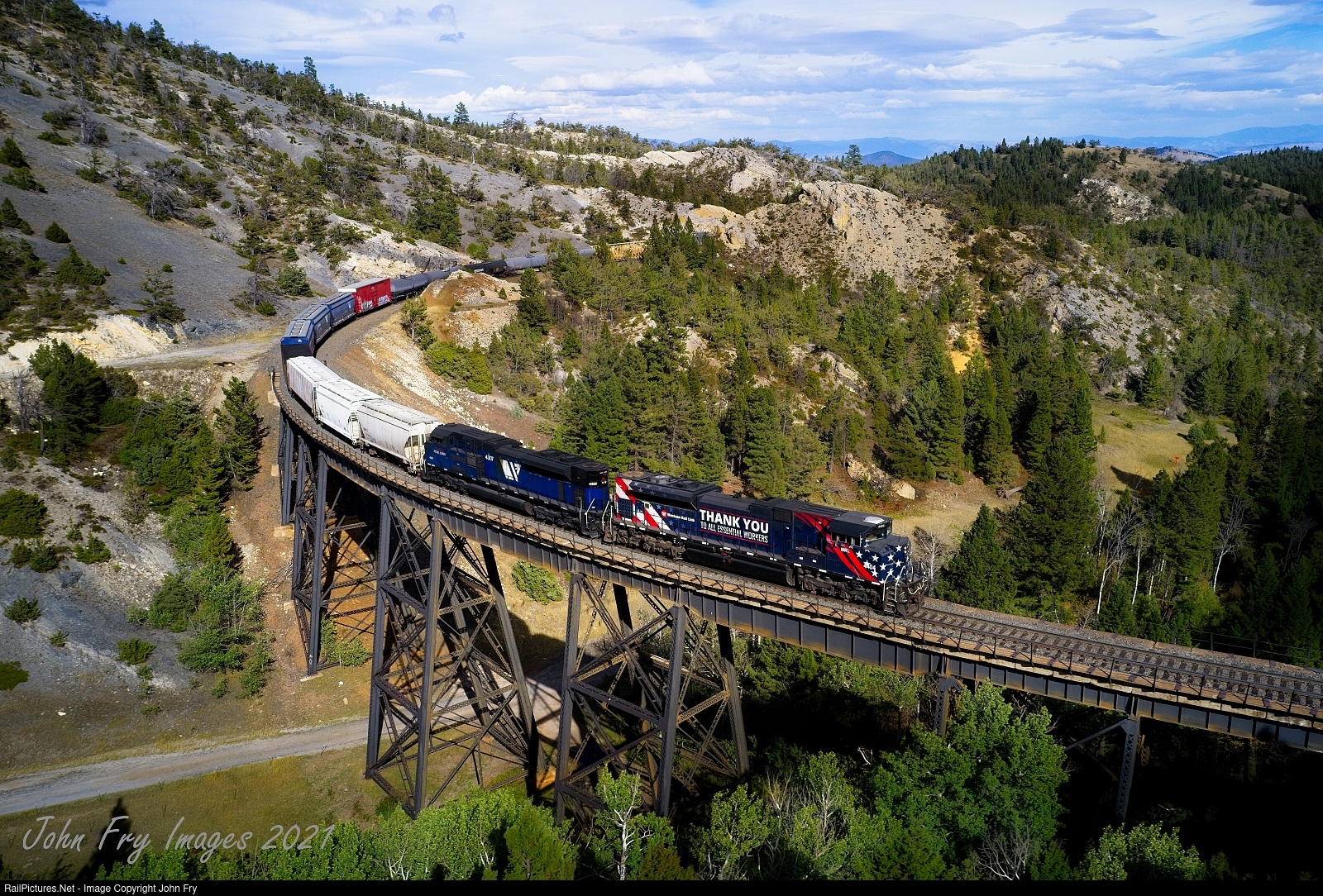 MRL's tribute to essential workers leads the LM across the Austin Creek trestle.