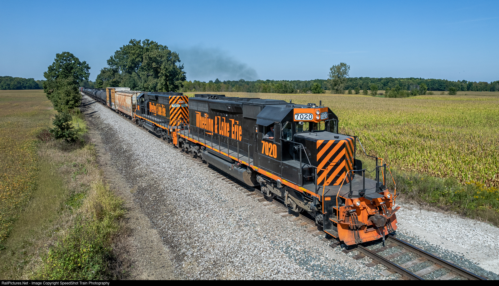 | Wheeling & Lake Erie 7020 Leads a two unit manifest SouthEast in Spencer Ohio on a beautiful Sunday through farmland country , He will eventually stop in Smithville Ohio for the evening |
