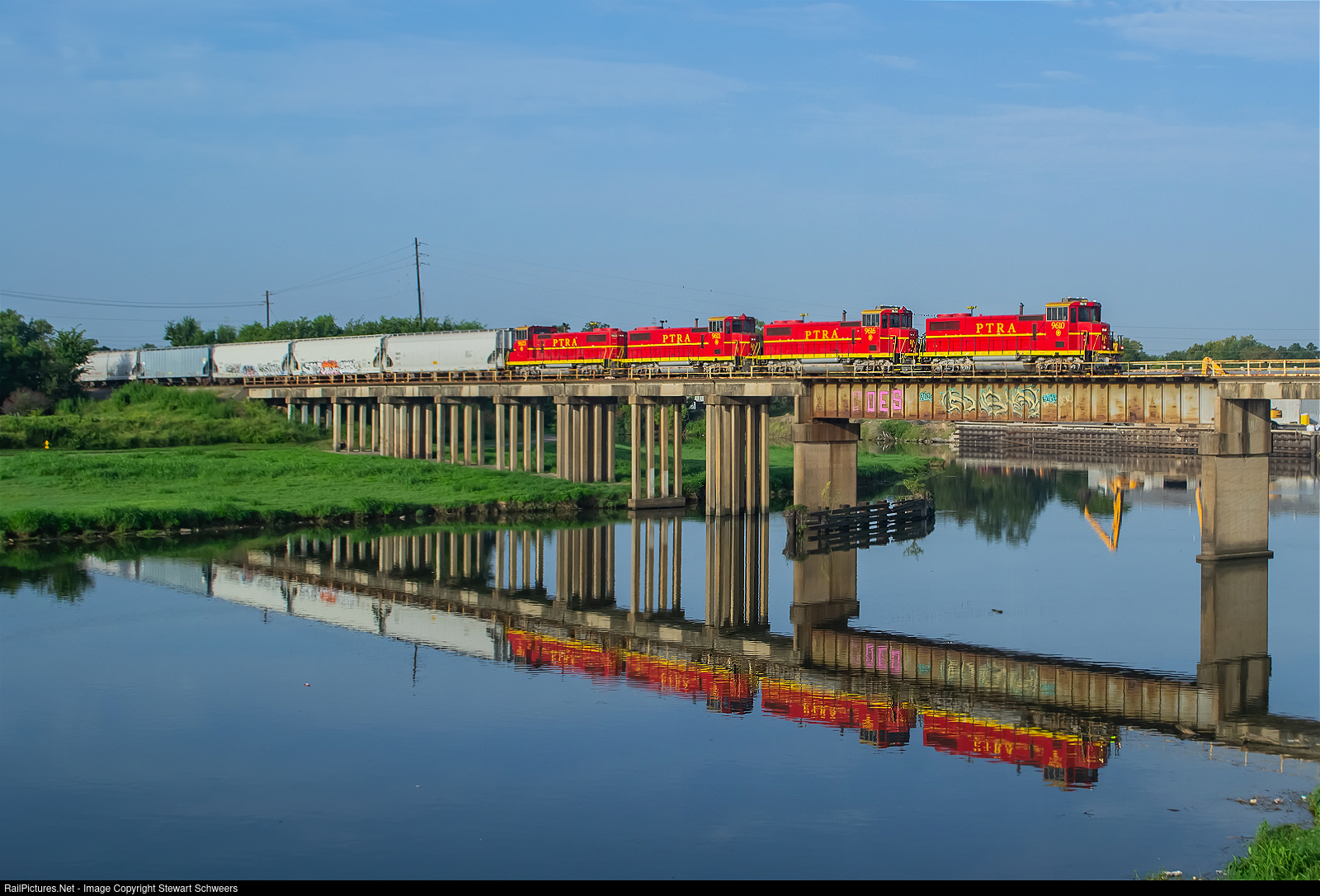| PTRA's Job 141 heads north along UP's Strang Sub in east Houston, crossing the bridge at Harrisburg over Brays Bayou. This morning's transfer from Manchester Yard to North Yard sports 4 of PTRA's unique MK1500Ds, soon to be replaced by generic blue GMTX Geeps. |