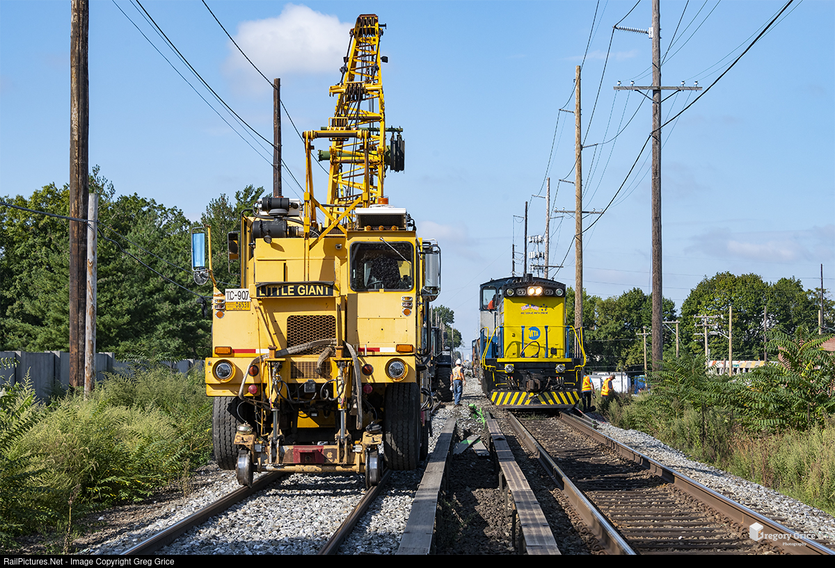 A Long Island Rail Road work train reverses down the out of service area on Main Line 3 in New Hyde Park shortly after the crews loaded a removed switch panel onto a flatcar.