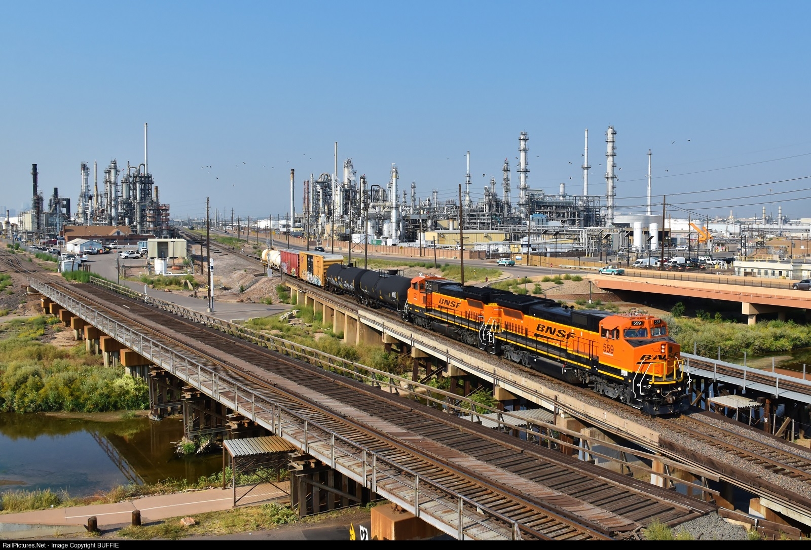 Ex Warbonnet BNSF 559 (B40-8W) leads a freight train through the refineries at Commerce City, Colorado.