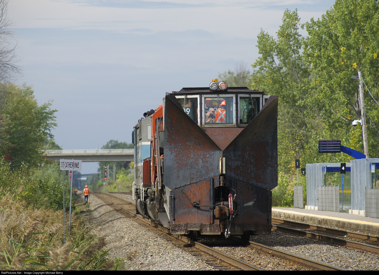 | Work 5999 is stopped and taking lunch at the Sainte-Catherine Station after ditching along the west track of the Adirondack Sub from Adirondack Jct. The consist is spreader CP 402898, CP 5999 and CMQ 9020. In the distance some CP employees check out the recently ditched right of way. |