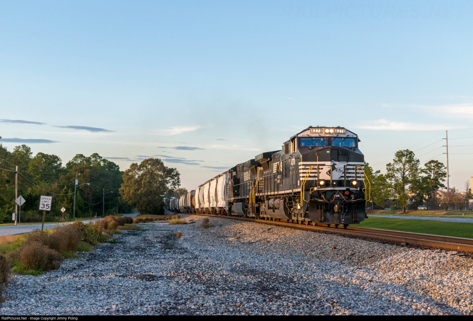 | NS 125 passes through the town of Warner Robins, GA as the last light of day shines on the sides of the locomotives. Robins Air Force base is just across the road to the right of the frame. |