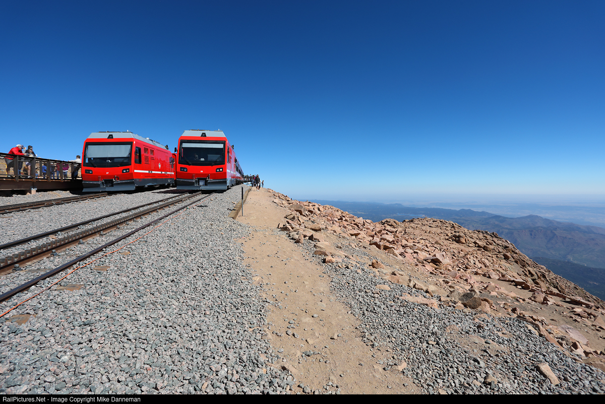A pair of Manitou & Pikes Peak Railway’s new cog diesel-electric locomotives and trainsets are at the very summit of 14,115-foot Pikes Peak on August 25, 2021. Built by Stadler Rail of Switzerland, each trainset consists of a locomotive and three passenger cars, with the last car also equipped as a cab control car. The M&PPR reopened in May 2021, after being shut down for nearly four years—during which time the railway was totally reconstructed, older cars were rebuilt and new equipment was built and delivered.