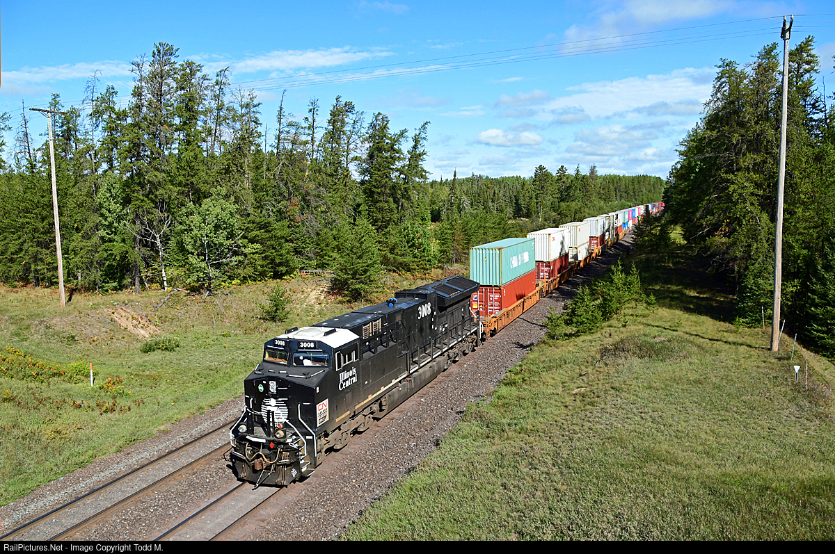 | CN 3008, the Illinois Central heritage scheme, is northbound on the CN Missabe Sub at iron Jct. MN as the DP unit on this Q train headed for Ranier and the crossing over the Canadian border and points west. |