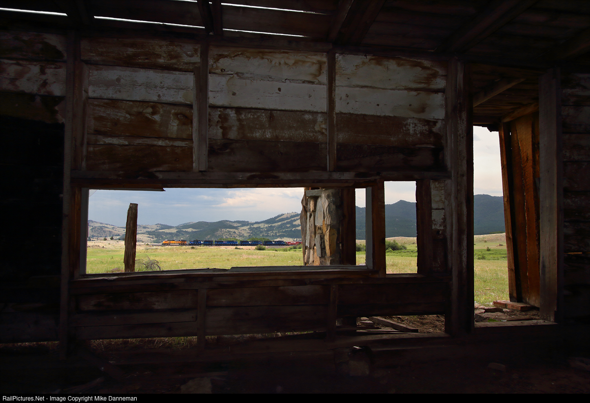 BNSF GE C44-9W No. 5383 leads four Montana Rail Link EMD SD70ACes as head end power for a heavy Herzog ballast train climbing Mullan Pass out of Austin, Montana, as seen from inside a deserted outbuilding of an abandoned ranch.