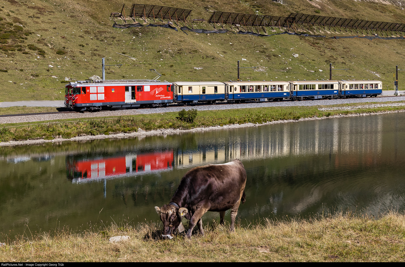 Baggage cogwheel railcar Deh 4/4 # 22 "St.Niklaus" of the Matterhorn-Gotthard-Bahn (MGBahn), built in 1975 for the Brig-Visp-Zermatt-Bahn (BVZ), is pulling the parlor car train EZ 951 from Disentis over the Oberalp pass to Andermatt-Oberwald-Brig, along the Oberalpsee on 2027 meter a.s.l., between Oberalppass and Nätschen. The train for celebration of 25 years of "Club 1889" makes a 5-day journey, from Tirano to the Gornergrat, all by parlor car. In the consist are baggage car D # 4051, parlor car As # 1143, piano/bar car WR-S # 3820 and parlor car As # 1144 of the Rhaetian Railway, built in the 1930'. There were about 60 guests on this journey, and there is a similar journey in the opposite direction for another about 60 guests, afterwards.