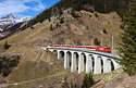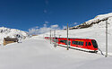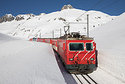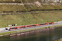 | "Komet" articulated lowfloor train ABDeh 4/8 # 2025 of the Matterhorn-Gotthard-Bahn (MGBahn), together with articulated lowfloor cab car ABt, is running the regional train 828 from Andermatt over the Oberalp pass to Disentis, along the Oberalp Lake. |