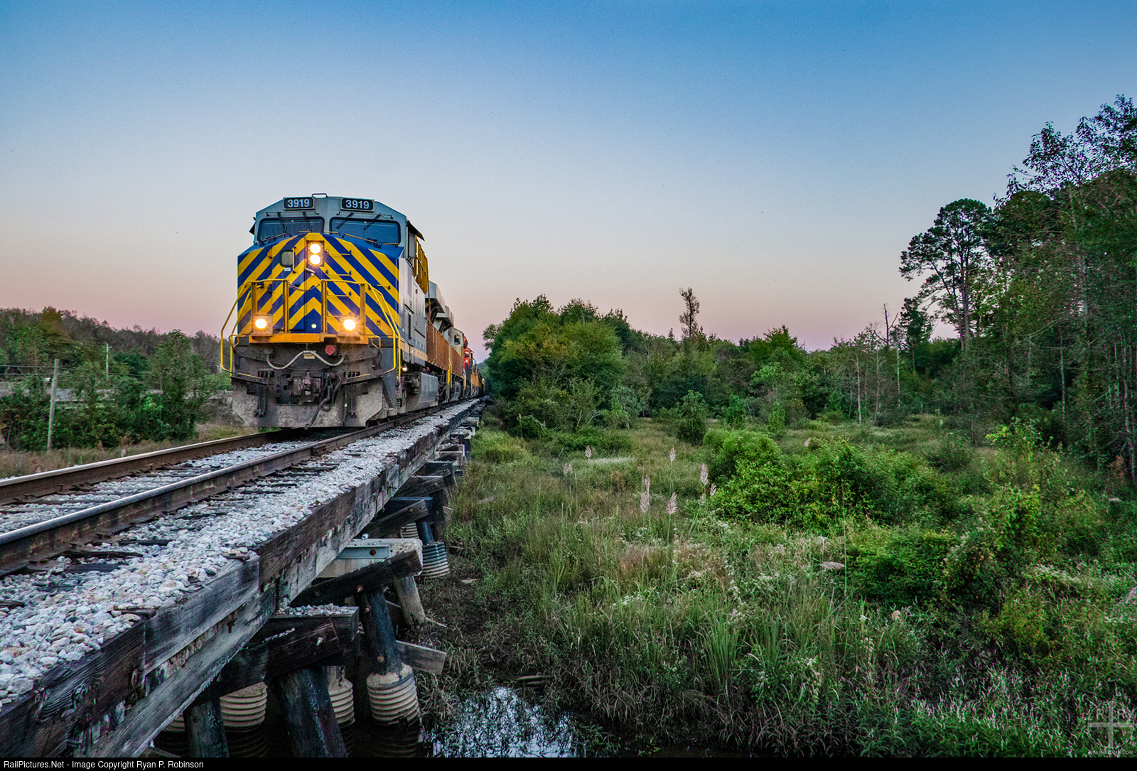 Alabama Southern train 112 winds down their journey to and from Tuscaloosa as they cross over the Lubbub Creek trestle at dusk with two ex-Citirail GEVOs leading.
