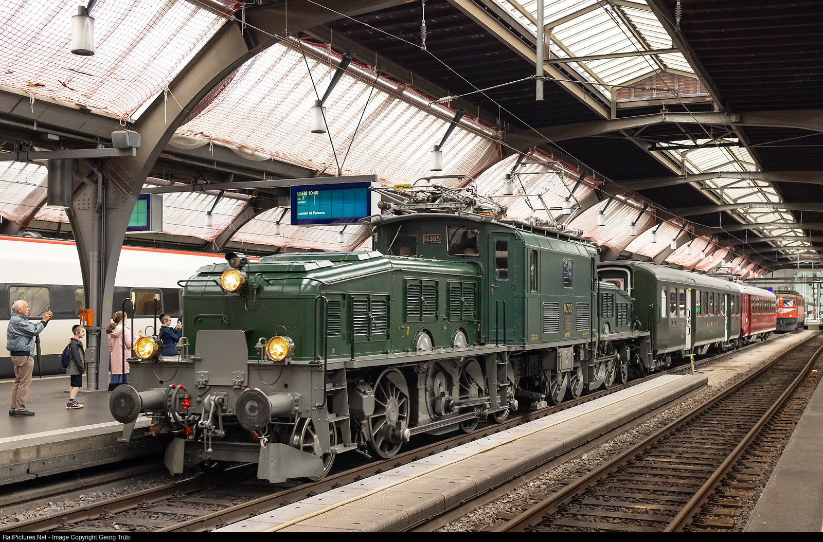| Farewell train for the retirement of an engineer of the SBB, as well as of the association "Krokodil 14305", with Ce 6/8 III # 14305 of SBB Historic, based in Olten. The train is departing from Zürich HB to Olten with cars B # 5560 and dining car WR # 702. In the background is Ae 6/6 # 11425 "Genève" of SBB Historic, which brought the cars into the hall. |