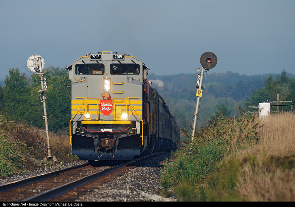 | What was thought to be an early morning southbound run to Toronto was pushed back account the derailment on the CP Parry Sound Sub for meets the whole trip down. So here is 40B minus CEO Keith Creel splitting the searchlights north of Bolton following CP 118 into the siding to meet CP 119 coming out of Vaughan. |