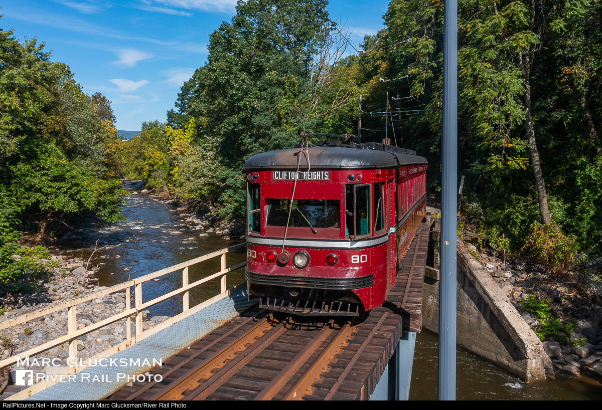 PST Brill "Master Unit" 80 crosses Roaring Brook in Scranton, Pennsylvania on Saturday, September 25, 2021 during the Friends of Philadelphia Trolleys charter. Although the scene itself is very rural in appearance, it is surrounded bay the densely populated and paved city.