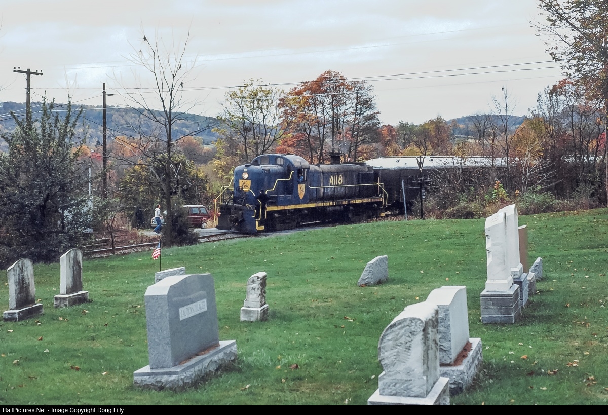 Or at least blowing the horn at the crossing. Former Delaware & Hudson RS3 4118 leads an Anthracite Railway excursion across Vera Cruz Road in Zionsville, Pennsylvania. The cemetery is part of the grounds of the Zionsville Bible Fellowship Church.