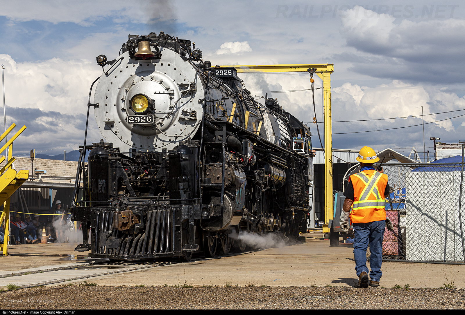 One of the volunteers of the New Mexico Steam Locomotive & Railroad Historical Society, the group that for more than 20 years has worked to restore Santa Fe 2926 back to operating condition, spots the 975,000 pound 4-8-4 as it struts up and down the track at "World Headquarters" with ease. Following the installation of insulation and sheet metal jacketing, there will be nothing to hold back the locomotive's 80-inch drivers from thundering down the mainline once again...something that hasn't been seen since the 1950's.