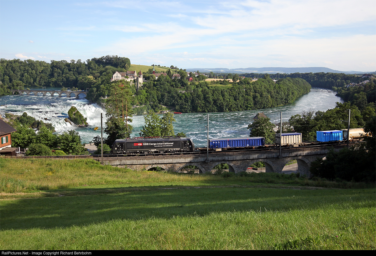 | Along the Rhine Falls 189 082 of Mitsui Rail Capital Europe, rented by SBB Cargo, heads an intermodal train from Gallerate (Italy) to Singen in Germany. |