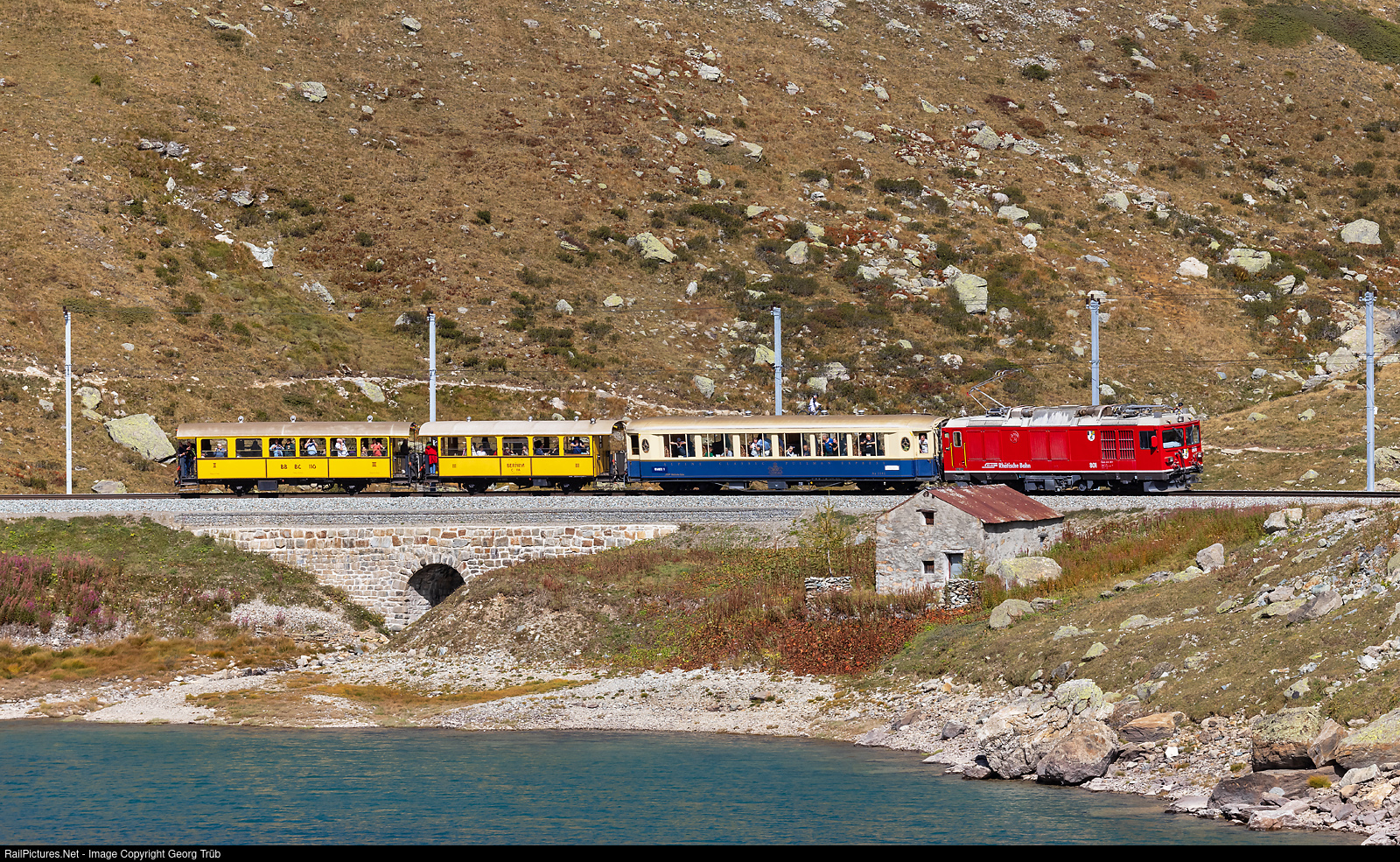 | Bi-mode diesel/electro locomotive Gem 4/4 # 801 "Steinbock/Capricorn" of the Rhaetian Railway is pulling train 2635 from Samedan to Tirano along the Lago Bianco through the Jochum curve, between Bernina Lagalb and Ospizio Bernina. The train with the parlor car As # 1141, the C # 114 "La Bucunada" and the BC # 110 "Il Mesolcines" circulated for the 25 years anniversary of the association "Club 1889", by parlor car from the Gornergrat to Tirano. |