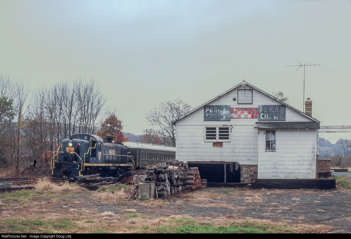 | An Anthracite Railway excursion Pennsburg slows to a stop near a former Purina feed dealer in Dillingersville, Pennsylvania. This is the turnaround point for the train, with a passing siding to allow the RS3 to run around its train. After the run around move, the train will back a few hundred yards to allow the passengers to experience the thrill of being inside Dillingersville tunnel.