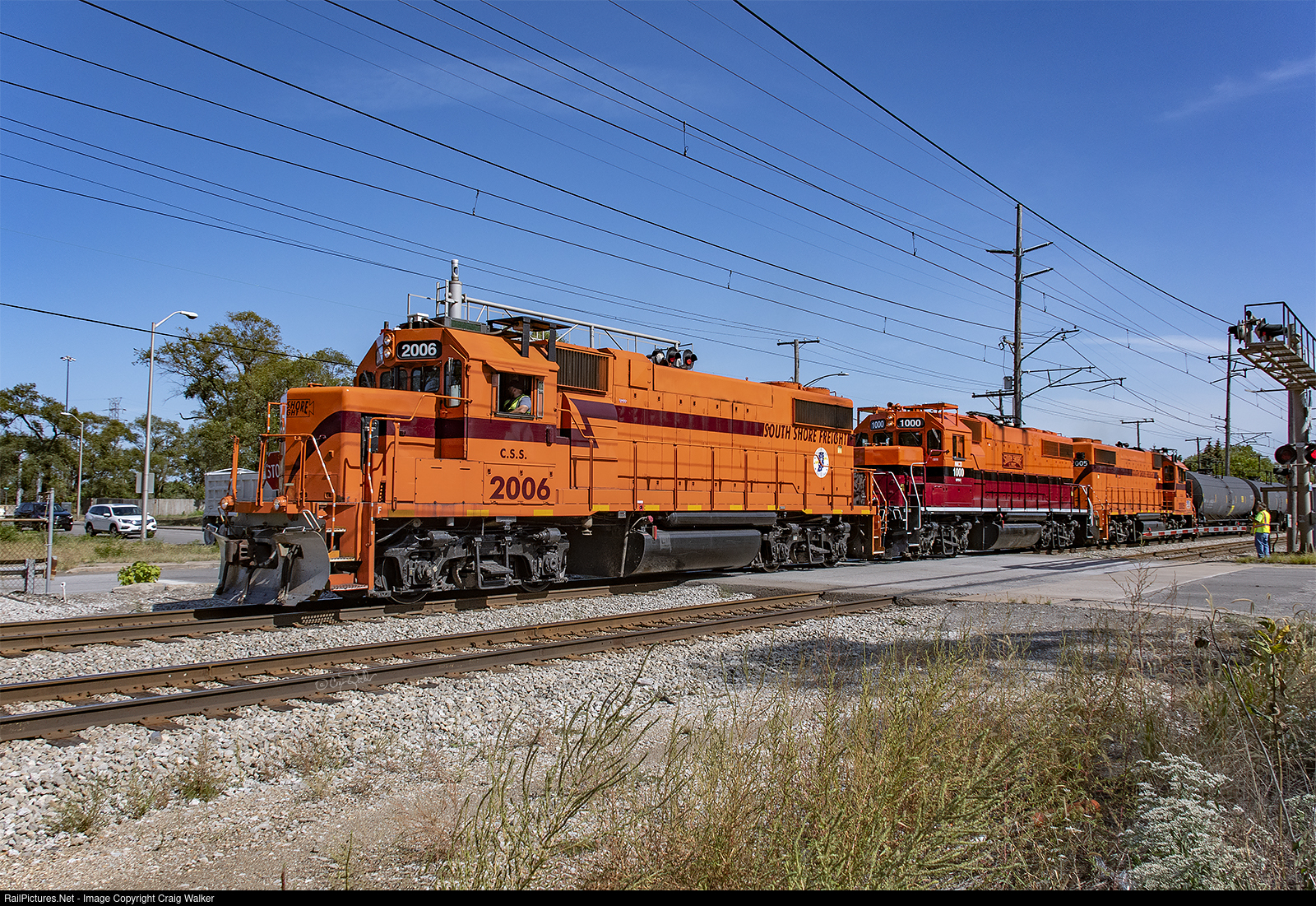 A Chicago South Shore & South Bend Railroad freight train, CSS AF4, behind CSS GP38-2 2006, NICD GP38-2 1000 (ex-RMPX GP40 6405, ex-GTW 6405, née-DTI 405) and CSS GP38-2 2005, hustles its way to the Belt Railway of Chicago from Bailey Generating Station in Burns Harbor IN. (Gary, Indiana – September 24, 2021