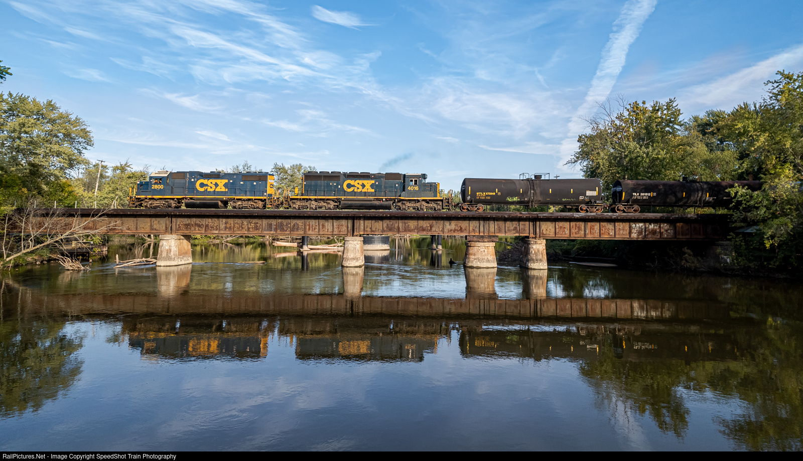 | (D700-30) CSX Local Job Rolls Eastbound (North) over the Kalamazoo River in New Richmond Michigan with CSXT 2800 Leader and 4016 SD40-3 trailing with 14 cars, heading back to Grand Rapids Michigan on a beautiful Fall evening |