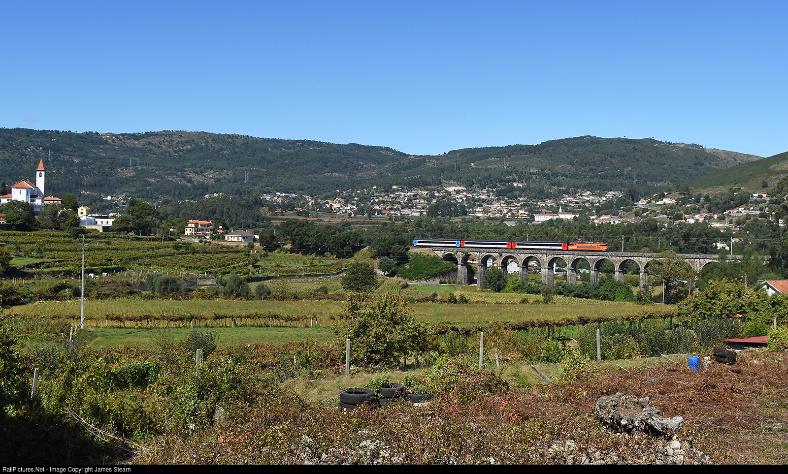 CP 2627 works south over Durreas Viaduct with a returning test run for the newly overhauled ex-Spanish 'Arco' coaches which are being overhauled for a return to service in Portugal.
