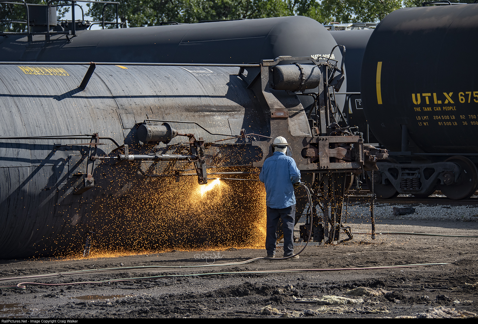 Visiting a freight car scrapper brings to mind the mythical elephants’ graveyard, as one is surrounded by the massive carcasses of rail cars whose useful lives have ended. Morbidly slicing them into smaller pieces to be recycled is a workman with a torch, creating a hypnotic cascade of sparks as he slices these behemoths into "bite-size" bits. (Lakeshore Railcar & Tanker Services, East Chicago, Indiana – September 26, 2021). Photographed on private property with permission and full PPE, along with necessary Covid precautions.