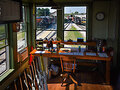 As viewed from the inside of the interlocking tower at the Monticello Railroad Museum, IC GP11 #8733 shoves the MRM freight demo towards Downtown Monticello during Monticello Railroad Days 2021.