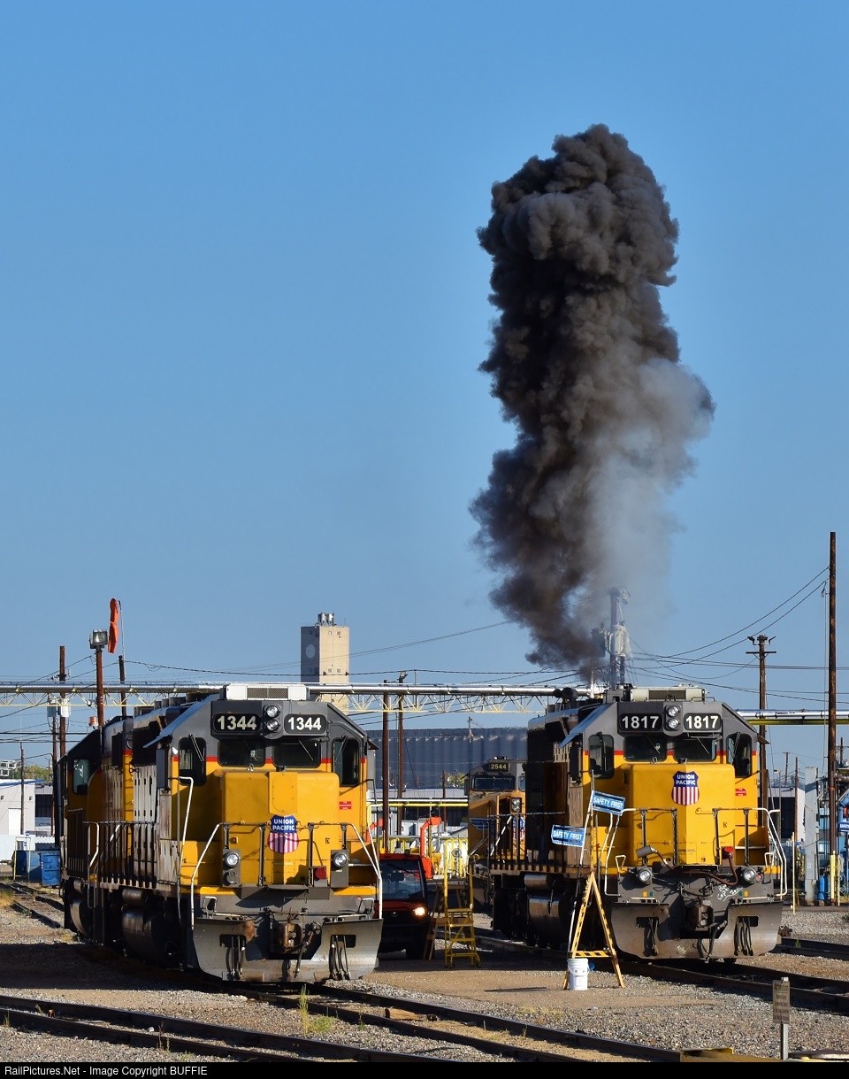UP 1344 (ex DRGW GP40-2) sits in the Union Pacific's North Yard as an adjacent engine belches a huge plumb of smoke as it starts up.