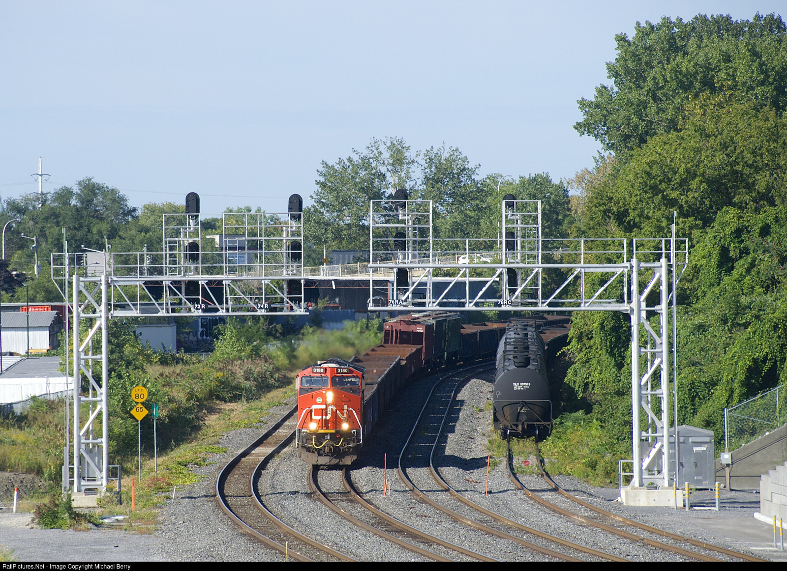 CN 322 is on its way to Southwark Yard after dropping off cars at Taschereau Yard as it prepares to pass a pair of signal gantries.