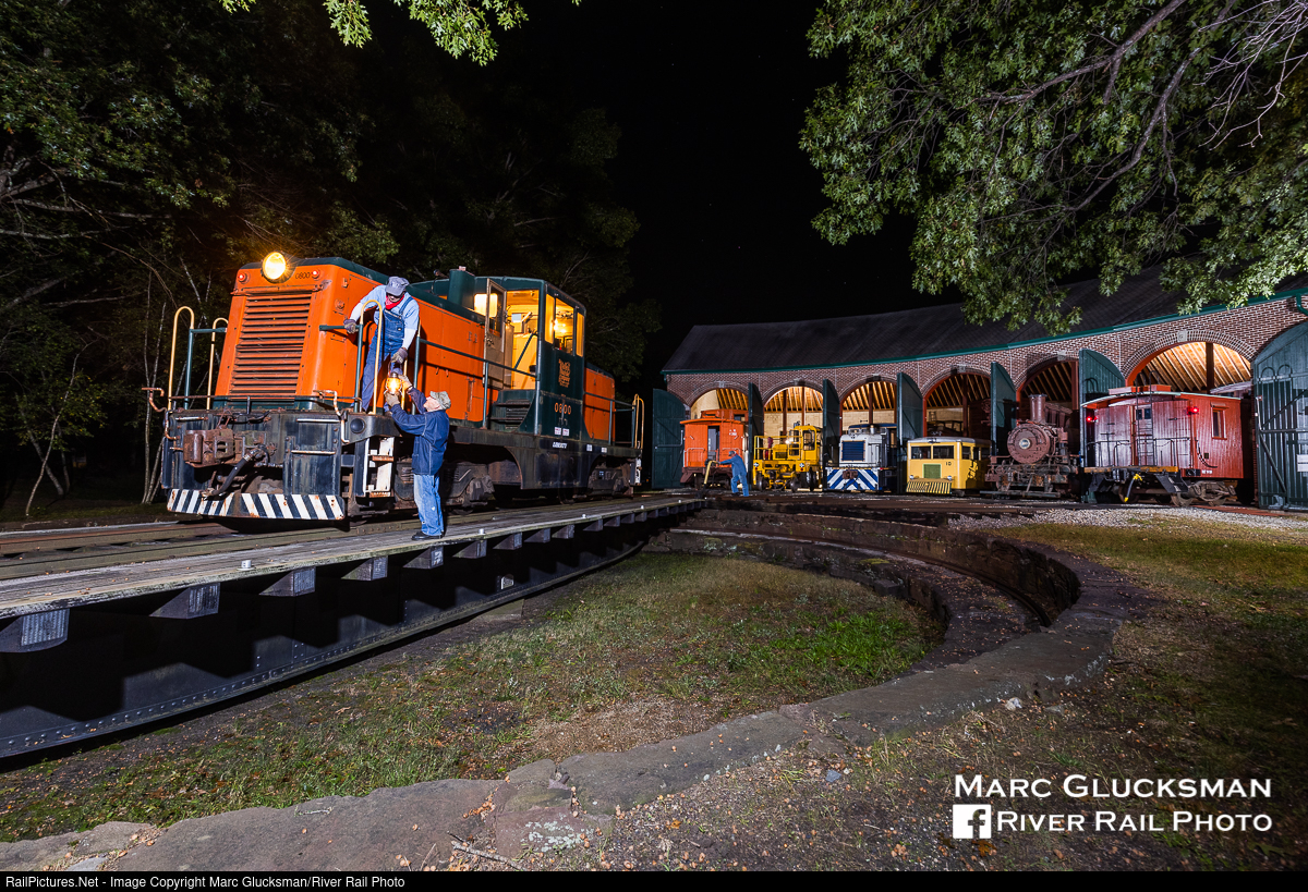 Museum volunteers pose on the 60 foot manually operated wrought iron Boston Bridge Works turntable (formerly located at the Boston and Albany Railroad facility in Dudley, Mass)on the night of Saturday, October 2, 2021. The engine on the turntable is former Long Island Rail Road #400 (GE 44T), left to right across in the roundhouse: Central Vermont Caboose #4052, Pfizer Corporation (Car Mover, Trackmobile), Northeast Utilities (GE 25T), Maine Central Railbus #10 (Fairmont Railways), Standard Steel Works Company #10 (0-4-0, Baldwin), and Rutland Caboose #40.
