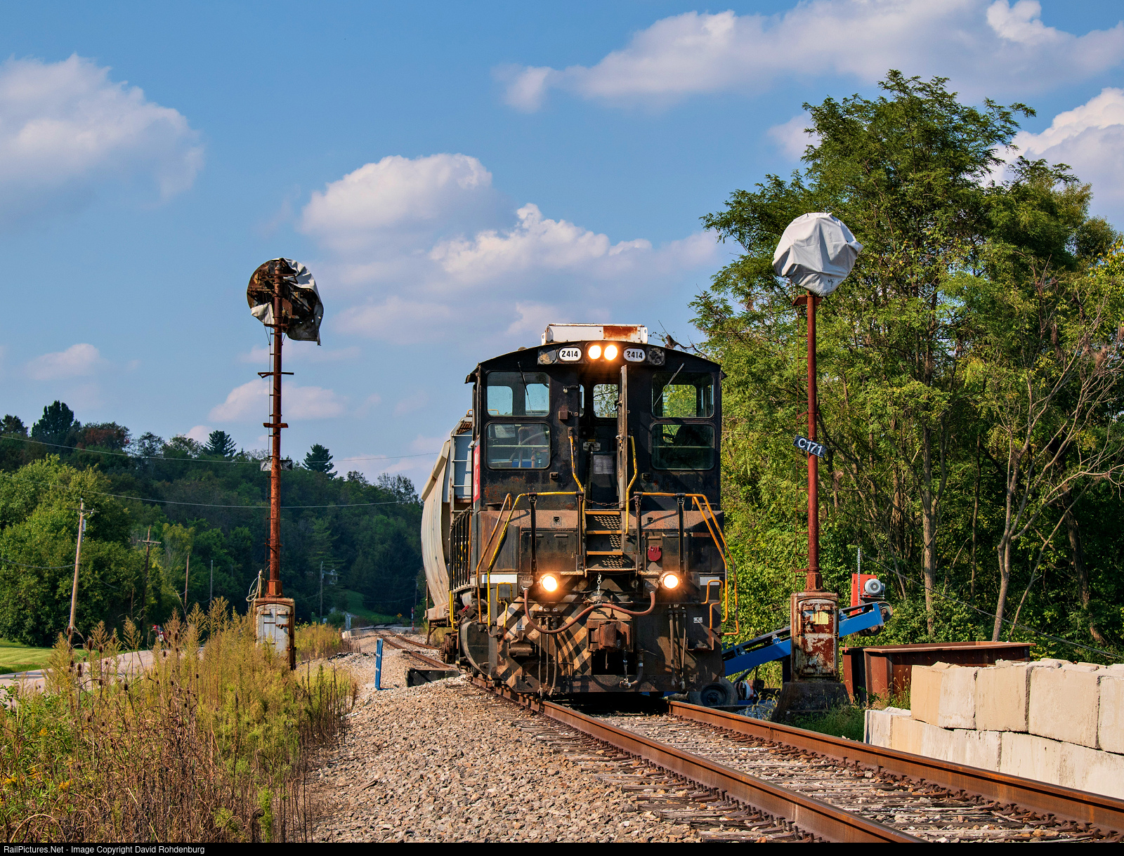Cincinnati Eastern MP15DC No. 2414 holds position with a single covered hopper to unload at the new CCET transload facility along Roundbottom Road in Milford, which happens to be located next to the retired N&W CPL signals at Milepost 17.1 on the Peavine.