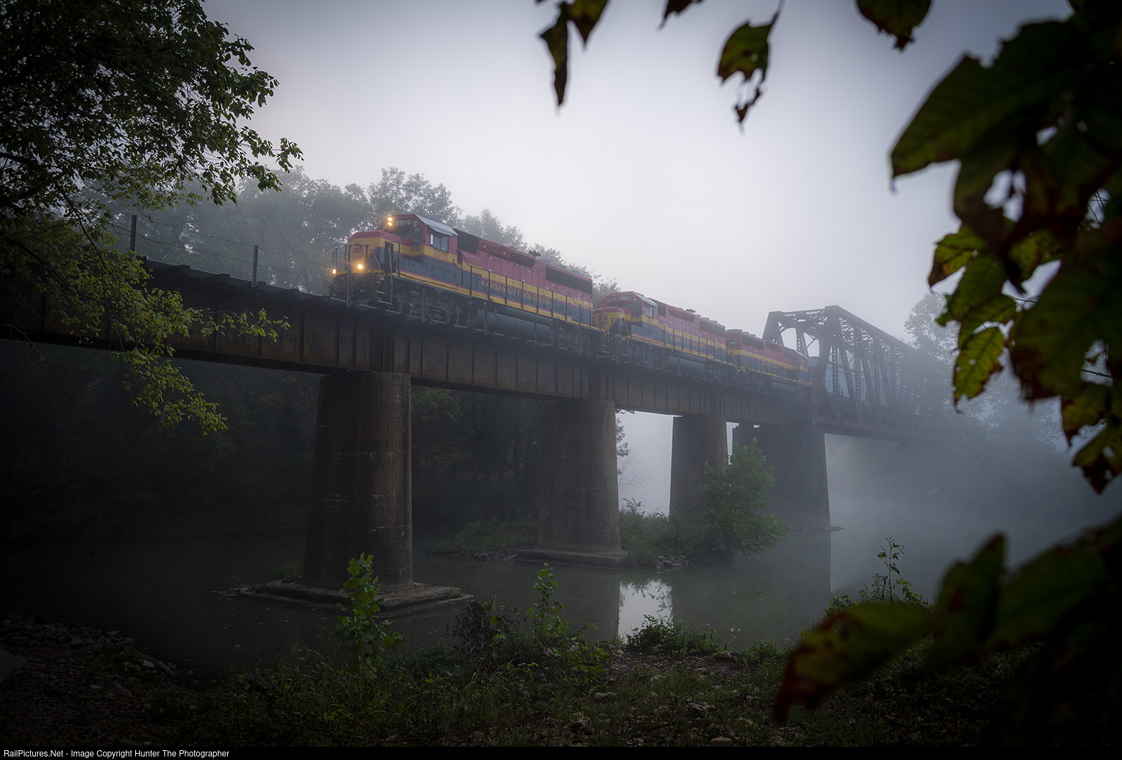 Three 4-axle EMD locomotives lead the "Watts Dodger" local train north across the Illinois River near Watts, OK on a cool and foggy October 4, 2021 morning.