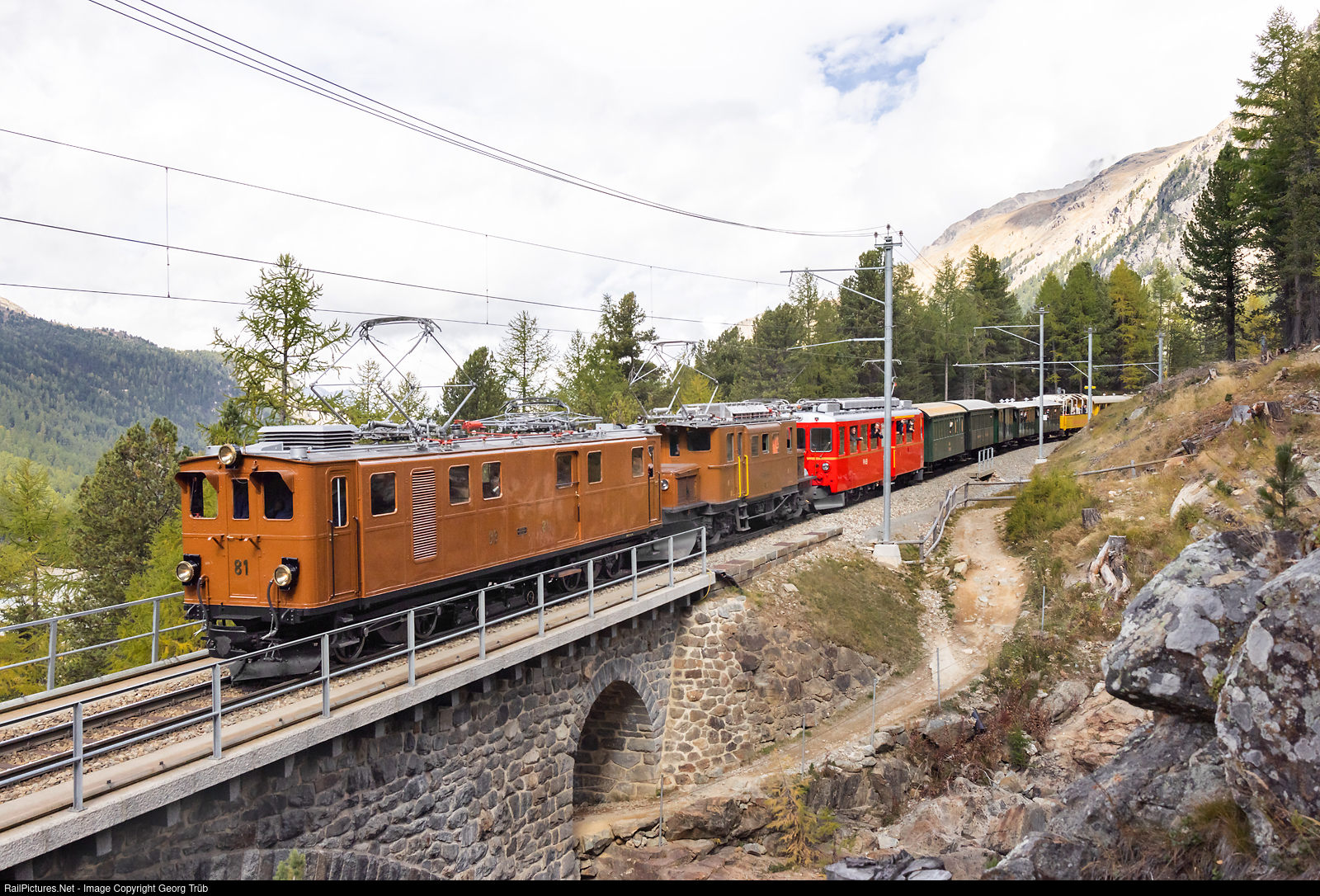 Locomotive Ge 4/4 # 81, built in 1916 by SLM and BBC for the Bernina Railway as Ge 6/6 # 81, now owned and operated by the Blonay-Chamby Railroad Museum, is on a several months visit on her old home rails, now part of the Rhaetian Railway. The perfectly renovated 705 kW locomotive is pulling the charter train 2616 "Le Fédéral" from Miralago over the Bernina pass to St.Moritz, organized by the association "Club 1889", over the Ova da Bernina bridge between Bernina Suot and Morteratsch. Second locomotive is the "Bernina Crocodile" Ge 4/4 # 182 of 1928 (RhB), third is railcar ABe 4/4 # 46 of the Rhaetian Railway.