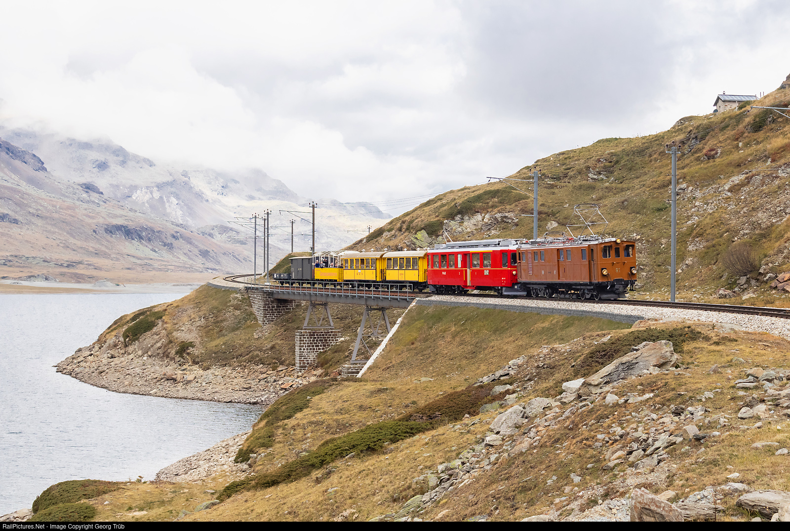Locomotive Ge 4/4 # 81, built in 1916 by SLM and BBC for the Bernina Railway as Ge 6/6 # 81, now owned and operated by the Blonay-Chamby Railroad Museum, is on a several months visit on her old home rails, now part of the Rhaetian Railway. The perfectly renovated 705 kW locomotive is pulling the charter train 2623 "Lago-Bianco-Riviera-Express" from St.Moritz over the Bernina pass to Tirano along the Lago Bianco between Ospizio Bernina and Alp Grüm. Helping is railcar ABe 4/4 # 46 of the Rhaetian Railway, built in 1965 and painted now in the appearance of the early 1970'.