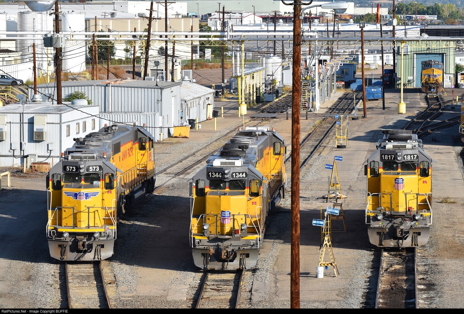 If you like to track vintage power then the Union Pacific's North Yard in Denver, Colorado is a good place to visit. Here we see UP 1344 , an ex Denver & Rio Grande Western GP40-2 (you can tell by the blanked off nose lights) built in 1974, as well as UP 573, an ex Southern Pacific GP38-2 built in 1980, and finally UP 1817, which was originally built in 1972 as a SD40-2 and later rebuilt as a SD40N.