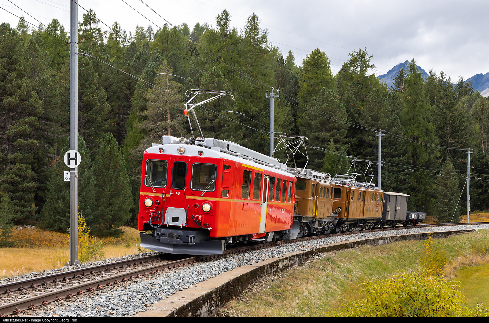 Railcar ABe 4/4 # 46 of the Rhaetian Railway, built in 1965, nowadays with the infrastructure department, in the appearance of the early 1970', is pulling the transfer train 9647 from St.Moritz to Pontresina, between Celerina Staz and Punt Muragl Staz. Second is "Bernina Crocodile" Ge 4/4 # 182 of 1928, third is Ge 4/4 # 81 of 1916, owned by the Blonay-Chamby Railroad Museum, on a several months visit in Grisons on the Bernina line of the Rhaetian Railway.
