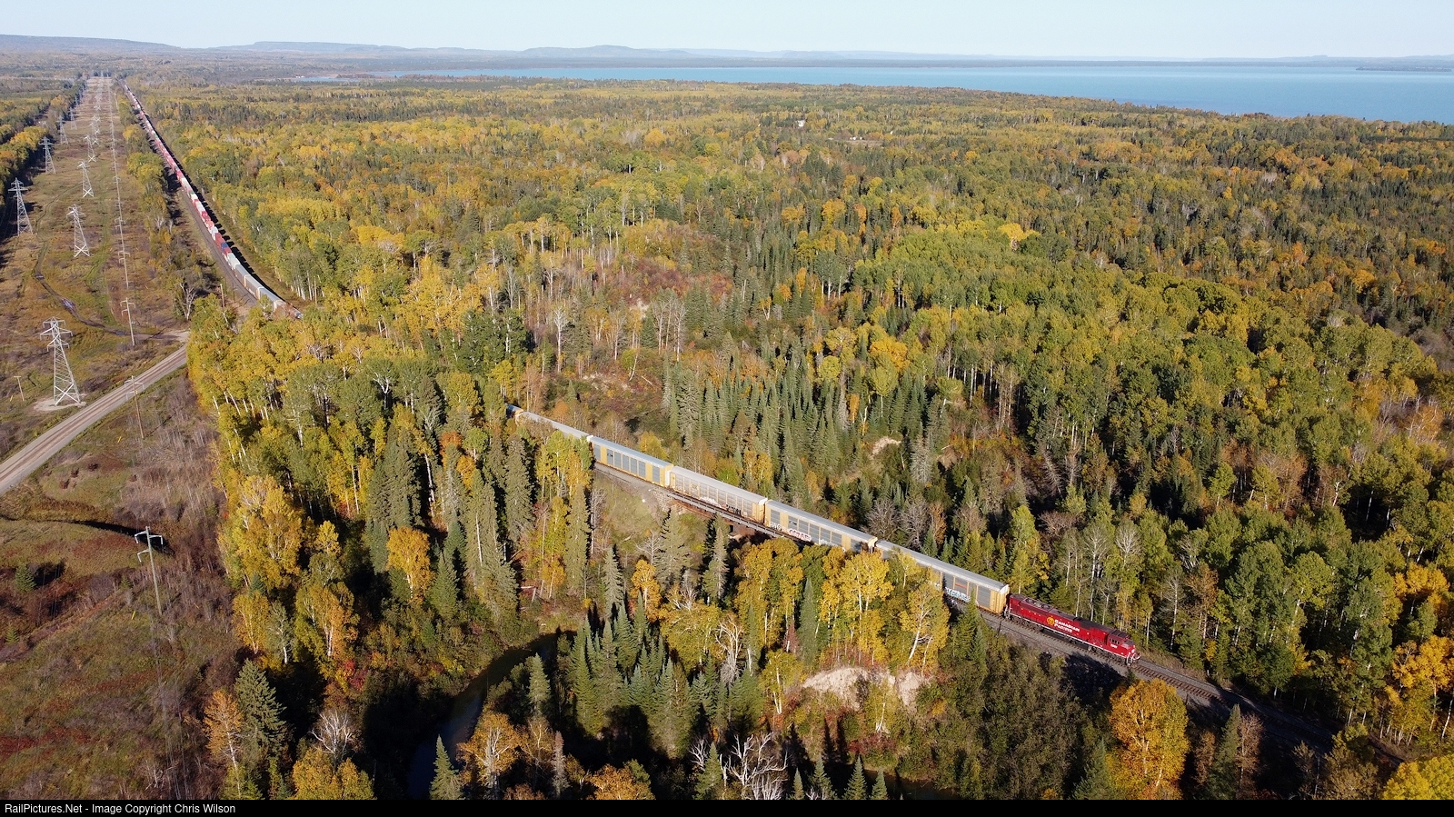 CP 112 cruises over Coldwater Creek and stretches out heading towards Hurkett. The North Shore of Superior is mainly yellow with an abundance of birch and poplar tree's.