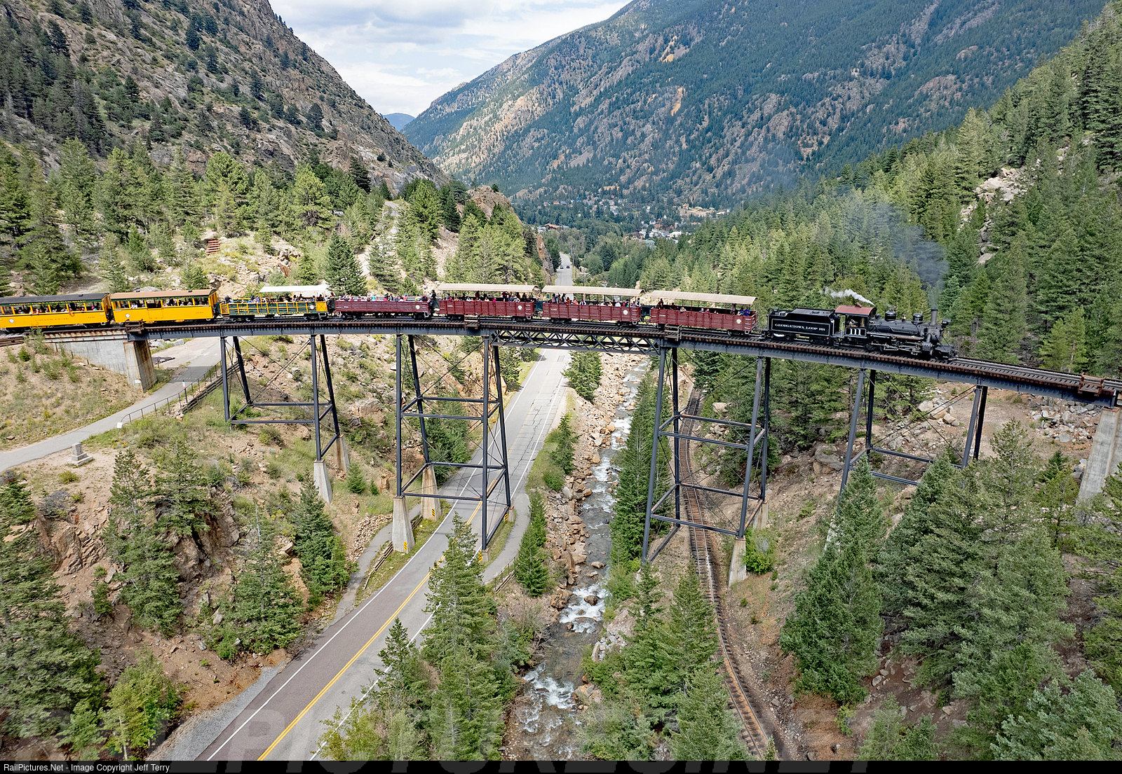 A Georgetown Loop train crosses the Devil's Gate high bridge 95 feet above the waters of Clear Creek. Tourists once rode from Denver to Silver Plume on the C&S to witness the same dramatic mountain scenery enjoyed by riders today (minus Interstate 70).