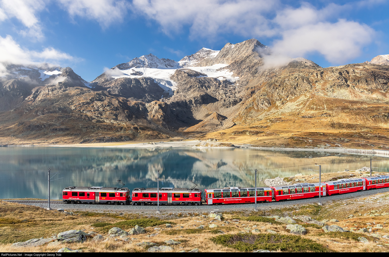 Railcars ABe 4/4 # 51 and # 53 of the Rhaetian Railway in multiple control are pulling PE 971 BERNINA EXPRESS from St.Moritz to Tirano along the Lago Bianco (White Lake) between Bernina Lagalb and Ospizio Bernina, with 3606 meter high Piz Cambrena and Cambrena glacier in the background.