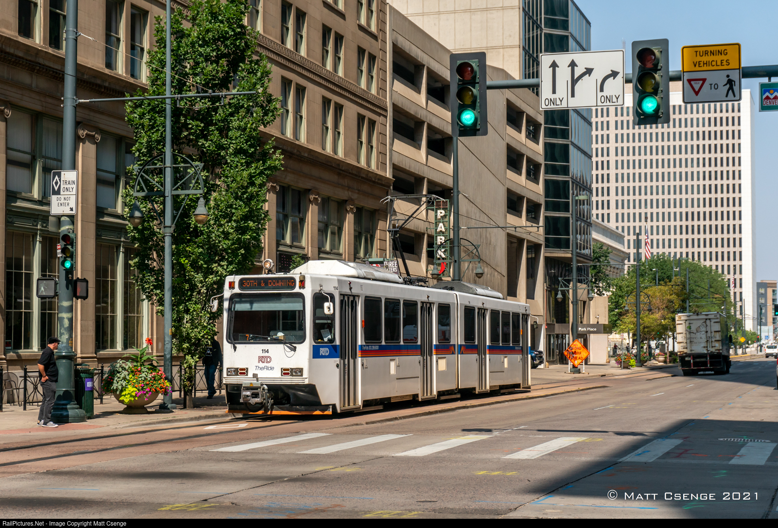 An RTD L Line train to 30th and Downing is seen at 17th St and Stout St as the light turns green. RTD trains run against traffic on most of the downtown loop, likely to reduce the risk of sideswipe accidents with turning vehicles. |